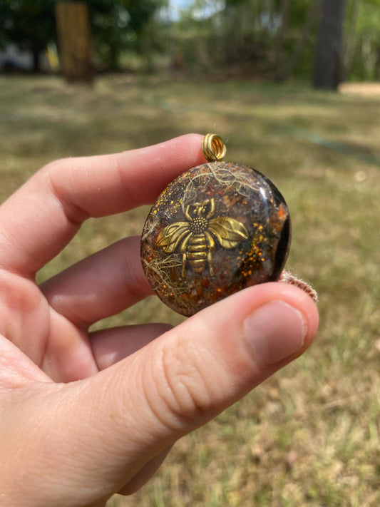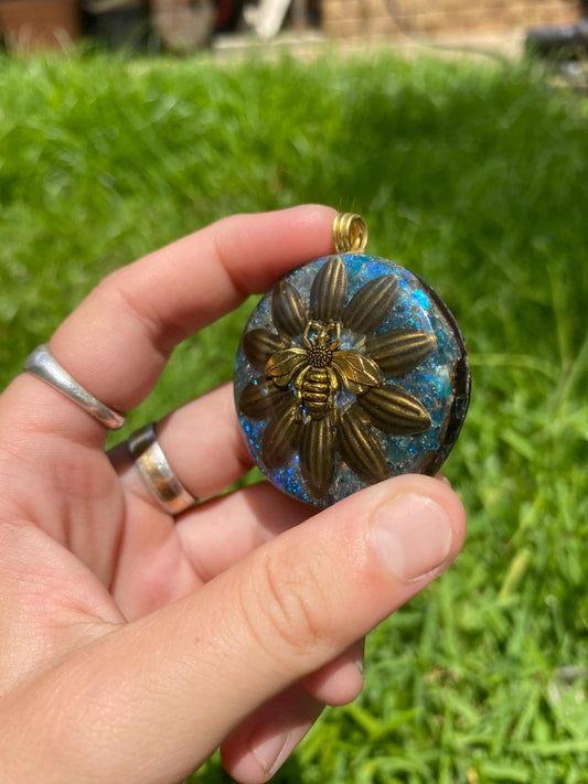 Bee layered over flower. Orgone Pendant Necklace. Made w Blue Apatite, & Elite Shungite. Tensor Ring. Powerful. EMF Protection.
