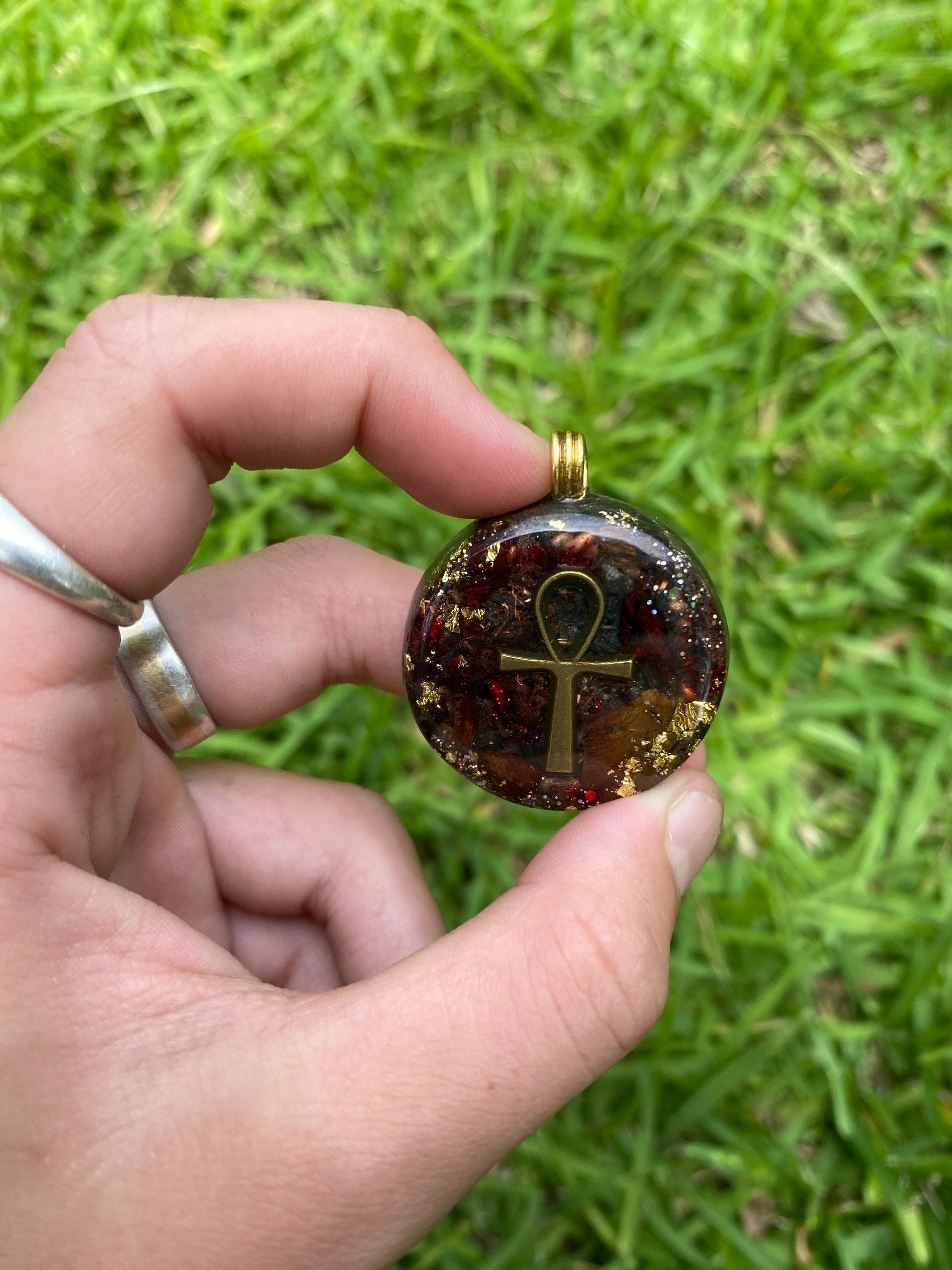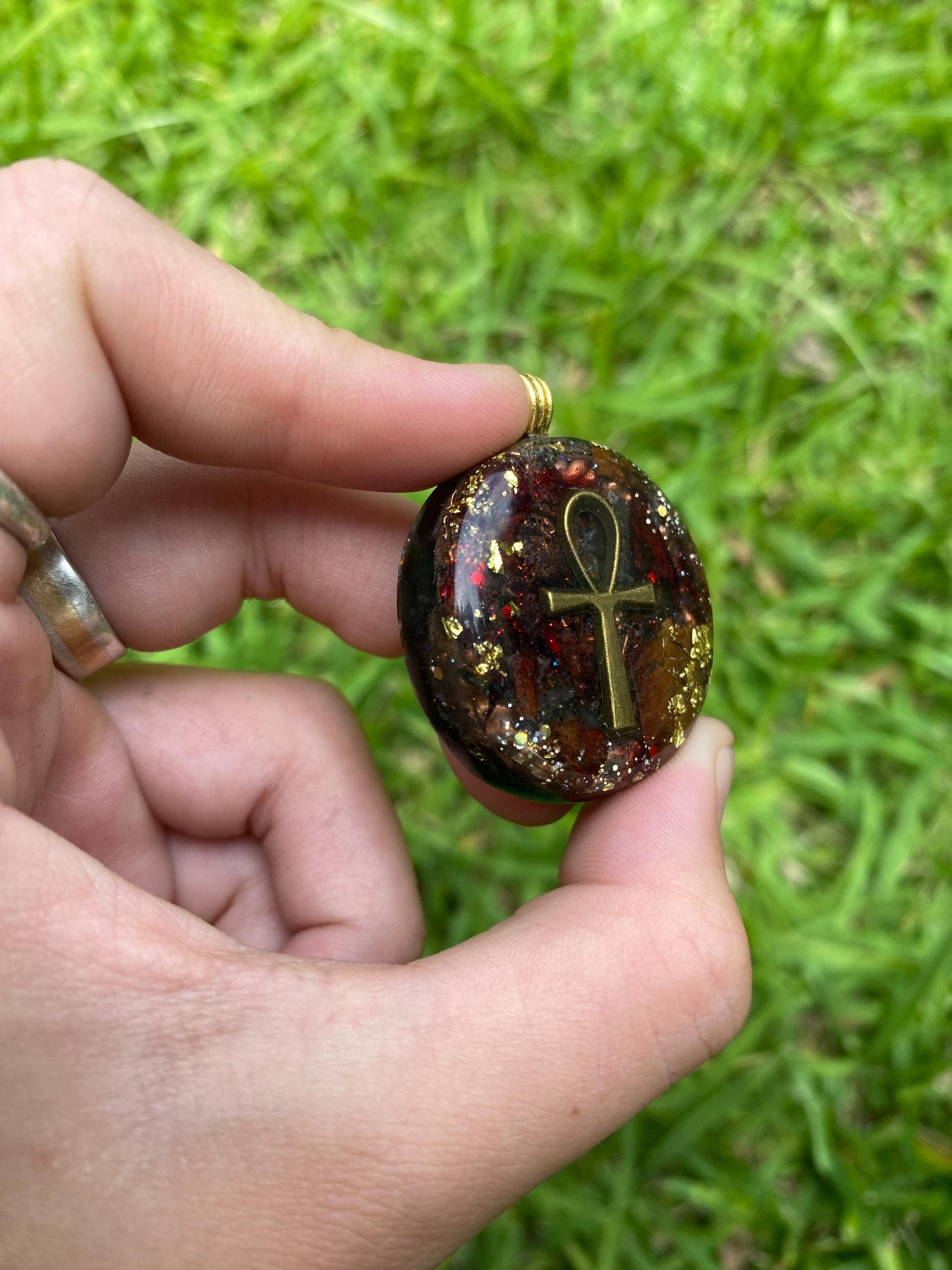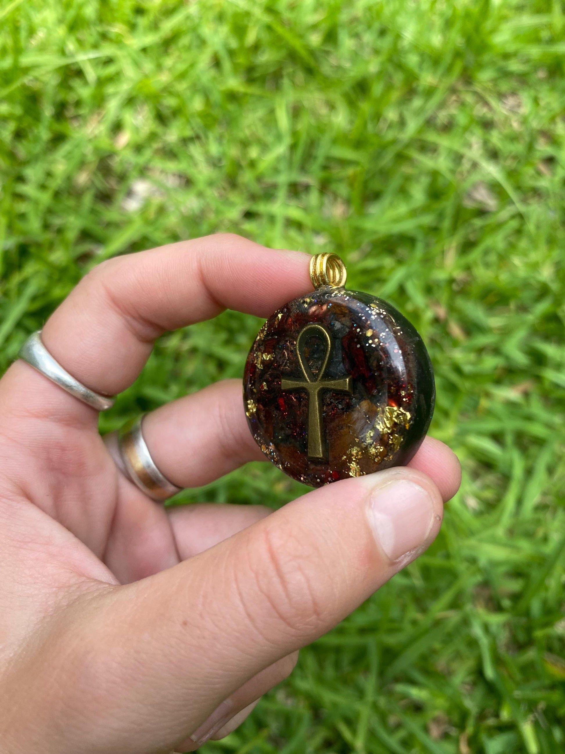 Ankh. Orgonite Pendant. Made with Black Kyanite, 24ct gold . rose petals and Tensor Ring 🖤