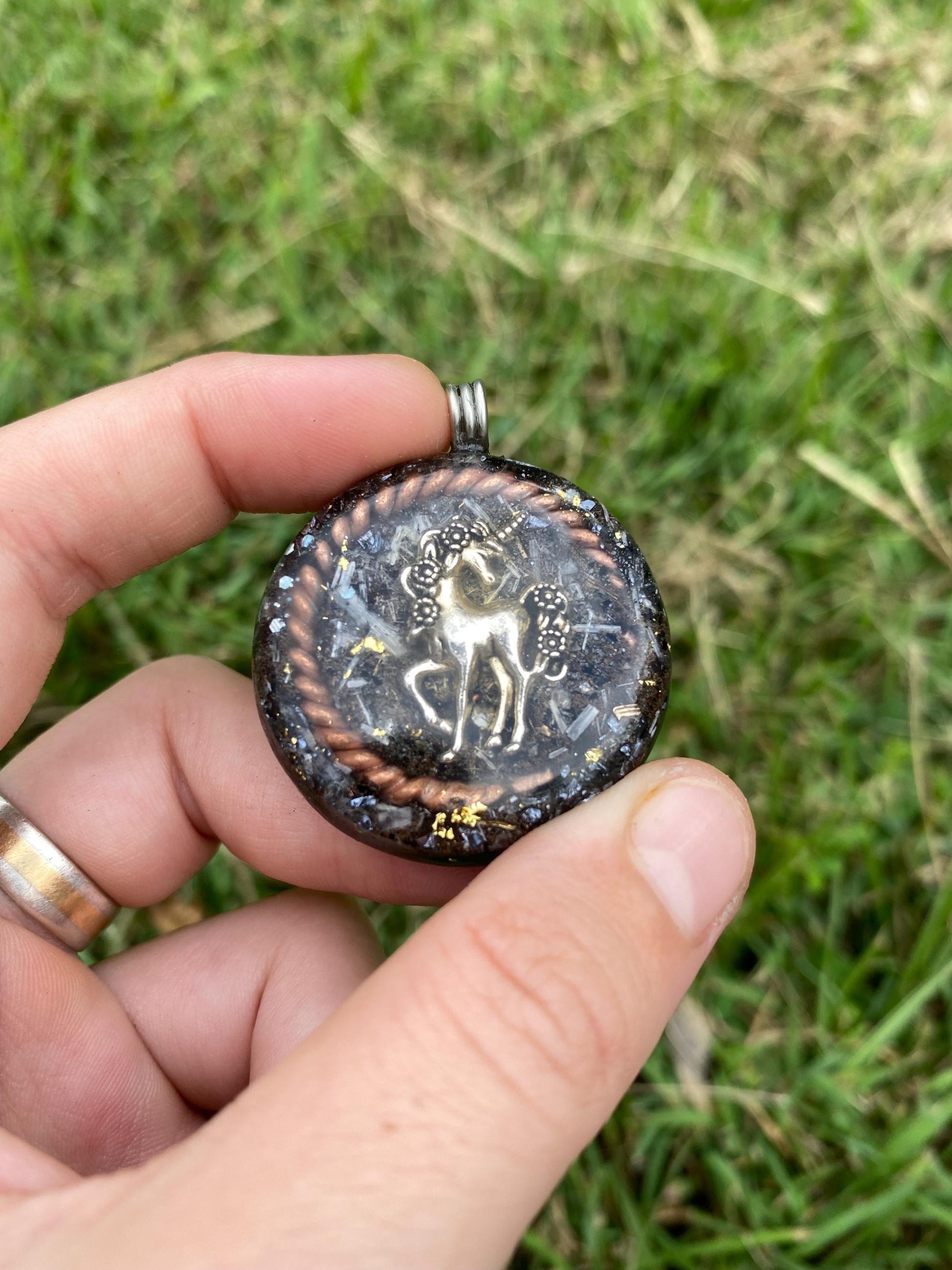 Unicorn, Orgonite Pendant. Made with a tensor ring, 24ct Gold and Mica!